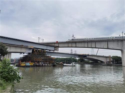 鋼箱梁分左右兩幅,材質為Q345qD,左右幅橋鋼箱梁重量為1898.6t。采用兩側帶挑臂的等高度單箱單室結構,平面位于圓曲線上,外側箱梁中心線圓曲線半徑R877.25米,內側箱梁中心線圓曲線半徑R862.75米;鋼箱梁主要由頂板、底板、腹板、橫隔板、橫肋及各自的加勁肋組成,外型幾何尺寸與砼箱梁保持一致,橋面設3%單向橫坡,橫坡指向曲線 內 側,箱梁中心線處梁高4.1米單幅鋼箱合段GL1和GL1梁段長5300mm重70t。左幅面跨中合批段長83133mm,右幅長81667mm。箱體及節段間連接全部采用焊接。